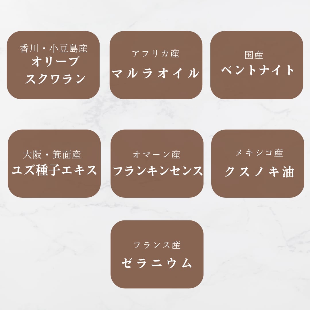 ■全成分 ベチベル根水・コメヌカ油・オリーブ果実油・バオバブ油・モクロウ・ツバキ種子油・フルボ酸・スクワラン・スクレロカリアビレア種子油・ベントナイト・ユズ種子エキス・ニュウコウジュ油・クスノキ木油・ニオイテンジクアオイ花油・香料